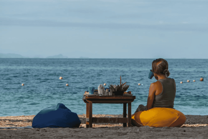 Before you leave, soak in the final rays and take a final shot from your patio. With the sea stretching endlessly before you and soft morning light spilling across the deck, it’s the perfect farewell photo: barefoot, coffee in hand, the ocean calm and glistening.